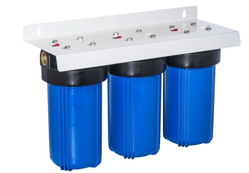 Trevoli 10" Triple Big Blue Jumbo Heavy Duty Filter Housings are manufactured using high quality Polypropylene. Compatible with a broad range of chemicals, ideal for high flow and heavy sediment applications. The standard bracket is powder coated steel but are also available with stainless steel brackets and with a stand. They accept a wide variety of 4½″ diameter cartridges. Filter housing options are also available with a high quality oil filled gauge.